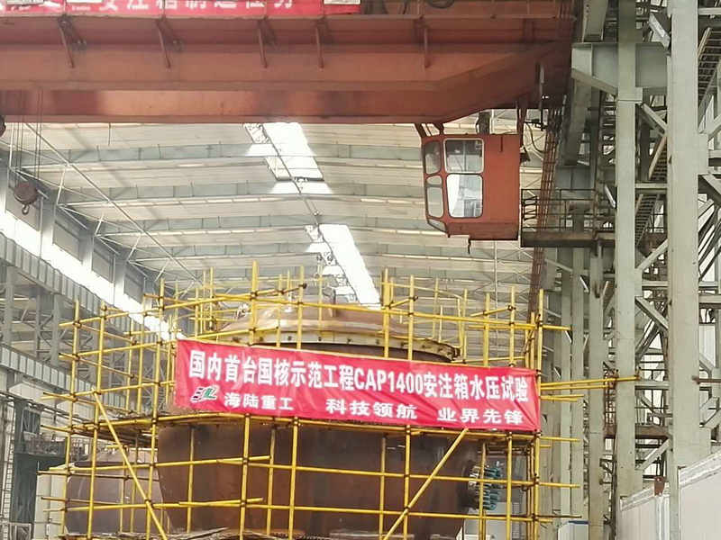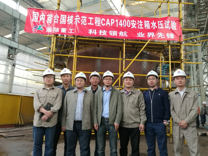 2017年4月25日16時(shí)20分,CAP1400示范工程1號(hào)機(jī)組首臺(tái)安注箱在海陸重工核電車(chē)間水壓試驗(yàn)順利完成!